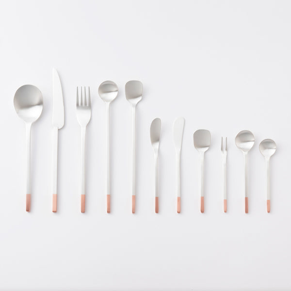 A pure copper Hime fork from "Kobo Aizawa" in Tsubame City, Niigata Prefecture, where metalwork and Western tableware production flourishes. The surface is silver-plated, and like silver tableware, the character changes the more it's used. After machine forming, the fine details and surface finishing are done by craftsmen by hand, and the slight variation in expression of each piece is one of its charms. It's the perfect shape for serving with cakes, Japanese sweets, and fruits.
