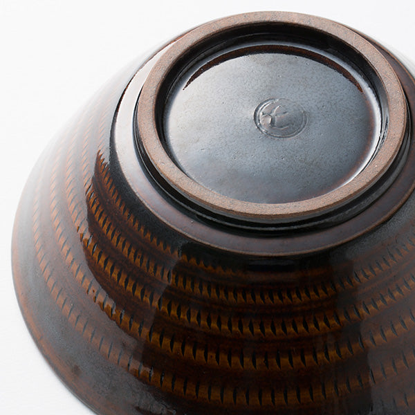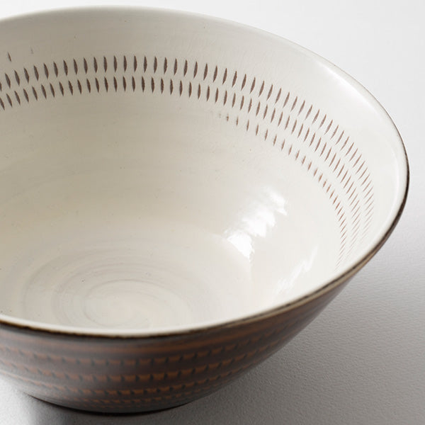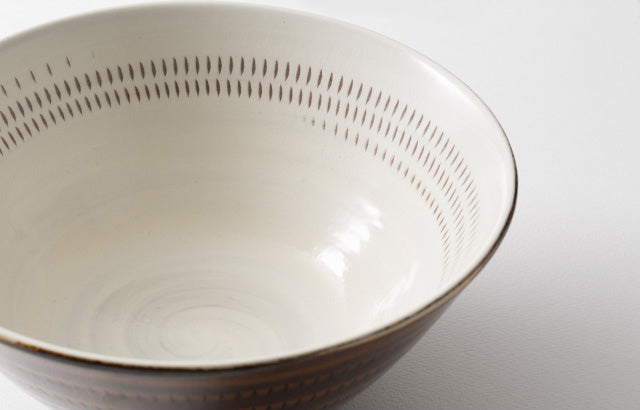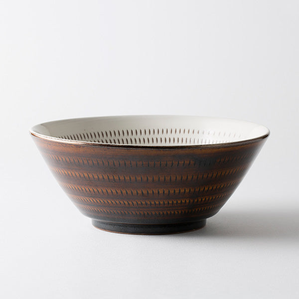 Koishiwara-yaki pottery from Toho Village, Asakura District, Fukuoka Prefecture has established the "beauty of utility" since the Edo period as everyday household items. These vessels are characterized by simple, warm designs featuring decorative techniques such as tobi-kanna (flying plane), hakeme (brush marks), and kushime (comb patterns). We collaborated with "Hayakawa Kiln," a pottery workshop operating in this Koishiwara region, to create these ramen bowls.