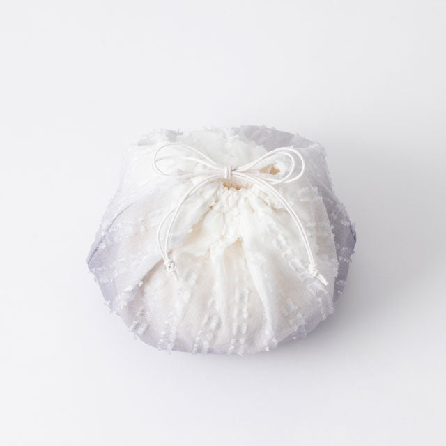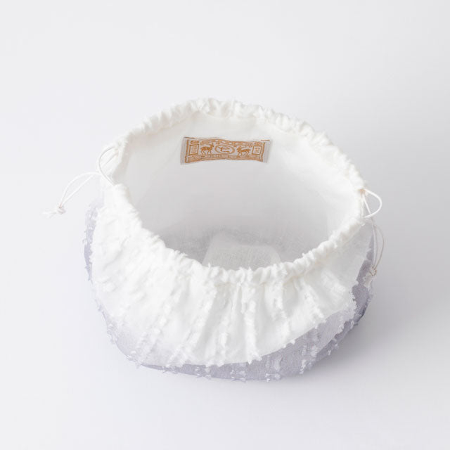 A pouch made from cut dobby fabric from Banshu Ori, which is known for its light fabrics such as shirting. The blurred pattern adds a touch of glamour. It is a convenient size for organising cosmetics and small items. The gathered fabric gives it a gentle and light finish.