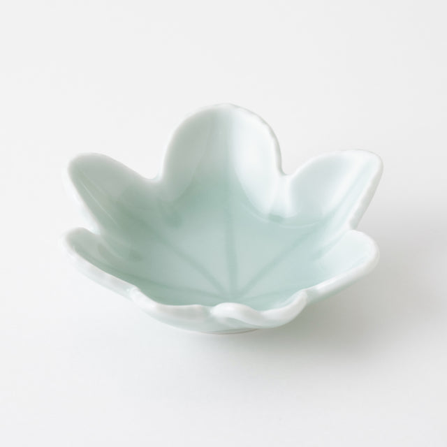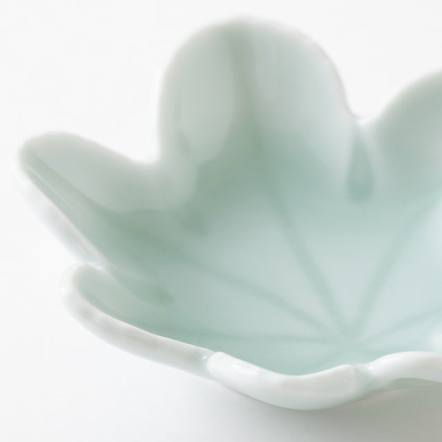 Covered with celadon glaze made from high-purity blue celadon stone found only in Okawachiyama, Imari City, it possesses a jade-like beauty. Adding the refreshing aesthetic of a blue maple leaf to your table, this piece is truly an artistic masterpiece.