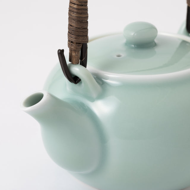 This teapot is crafted by Kosen Kiln, a pottery that preserves the traditions and techniques of Nabeshima and Imari ware in Imari City, Saga Prefecture. Covered with celadon glaze made from high-purity blue celadon stone found only in Okawachiyama, Imari City, it possesses a jade-like beauty.