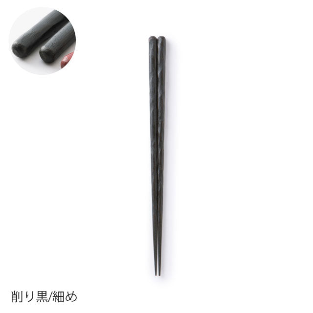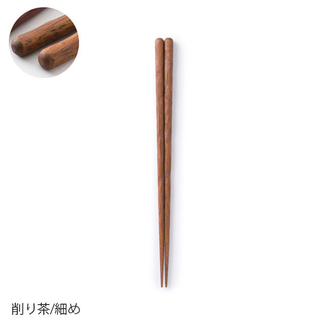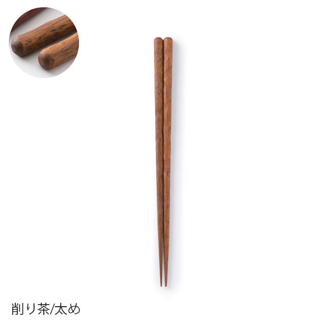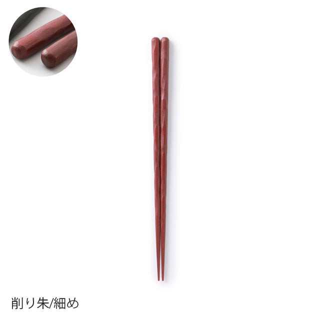 Each design is available in two thicknesses: 'standard' and 'slender.' However, since the optimal thickness varies by shape, we've carefully adjusted the measurements even within the same category. For example, while square chopsticks measure 8.0mm in the standard thickness, the hand-carved 'Kezuri' style uses 8.0mm for the slender version, as its rounded form naturally feels thinner in hand. Though these may seem like subtle distinctions, we believe such attention to detail is essential when choosing chopsticks for daily comfort. We approached this design challenge without compromise. Available in three refined colours: vermillion, brown, and black.