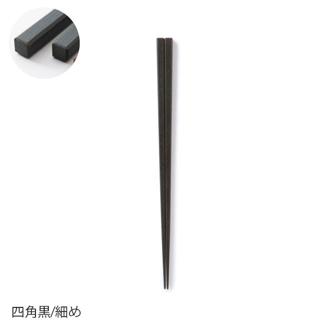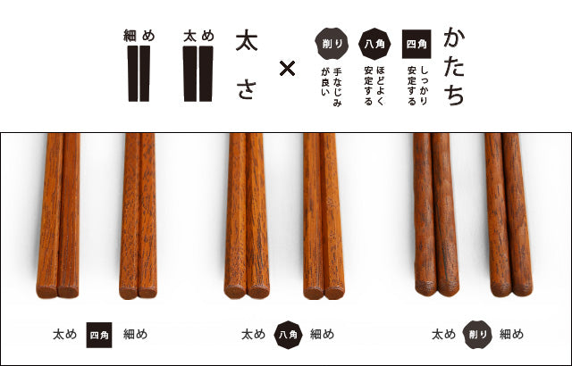 Generally, it is said that the length of chopsticks is important when choosing them, but after doing some research, we found that the length that is easy to use for both men and women is almost the same, and that the difference lies in how comfortable they are to hold. For this reason, the length is the same for all chopsticks, 22cm. As for the shape that affects how comfortable they are to hold, we offer three types: "square" which allows for a firm and stable grip, "octagonal" which has a good balance between stability and comfort in the hand, and "shaved" which fits comfortably in the hand.