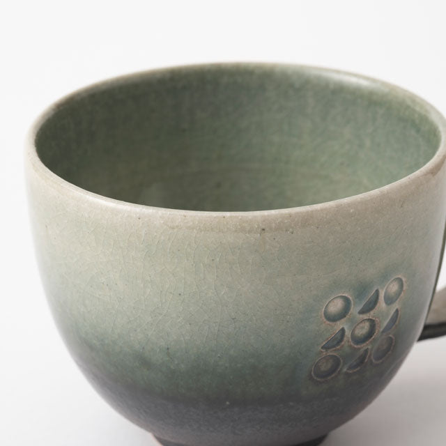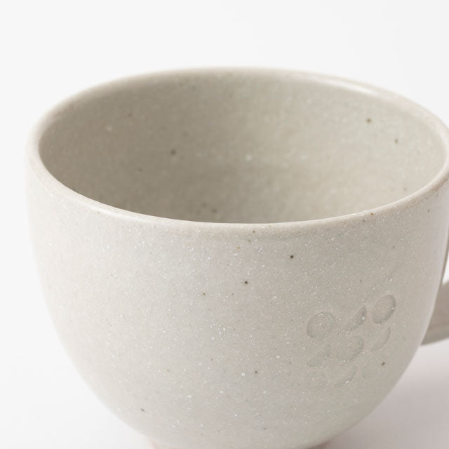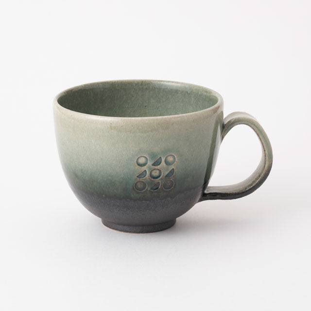 This mug from the "Sun and Moon" series is created by Meizan Kiln, a pottery that has continued in Shigaraki for approximately 400 years. It features Japanese-style patterns based on Meizan Kiln's logo mark. Characterised by simple colours that coordinate easily, the luster and texture of the glaze, and a warm form.