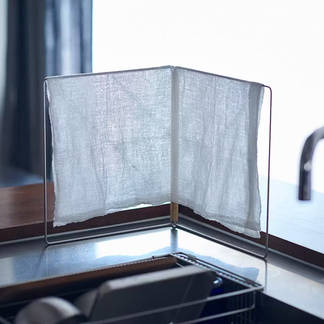 The rack can be folded in half for compact storage, combining both reduced drying time and storability. It accommodates various hanging configurations—two folded Hana Fukin, two spread-out Kaya-ori dishcloths, and more—making it versatile depending on how you arrange your cloths.